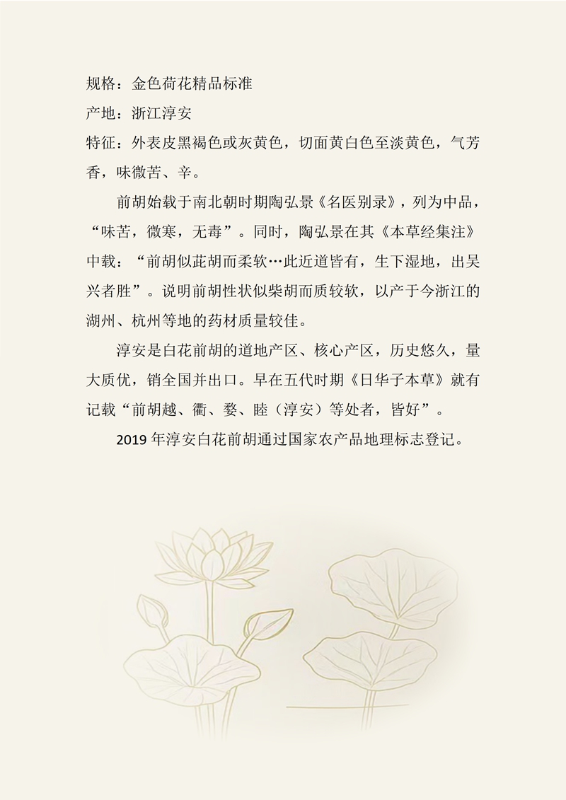 规格:金色荷花精品标准 产地:浙江淳安 特征:外表皮黑褐色或灰黄色,切面黄白色至淡黄色,气芳香,味微苦、辛。 前胡始载于南北朝时期陶弘景《名医别录》,列为中品,“味苦,微寒,无毒”。同时,陶弘景在其《本草经集注》中载:“前胡似芘胡而柔软…此近道皆有,生下湿地,出吴兴者胜”。说明前胡性状似柴胡而质较软,以产于今浙江的湖州、杭州等地的药材质量较佳。 淳安是白花前胡的道地产区、核心产区,历史悠久,量大质优,销全国并出口。早在五代时期《日华子本草》就有记载“前胡越、衢、婺、睦(淳安)等处者,皆好”。 2019年淳安白花前胡通过国家农产品地理标志登记。