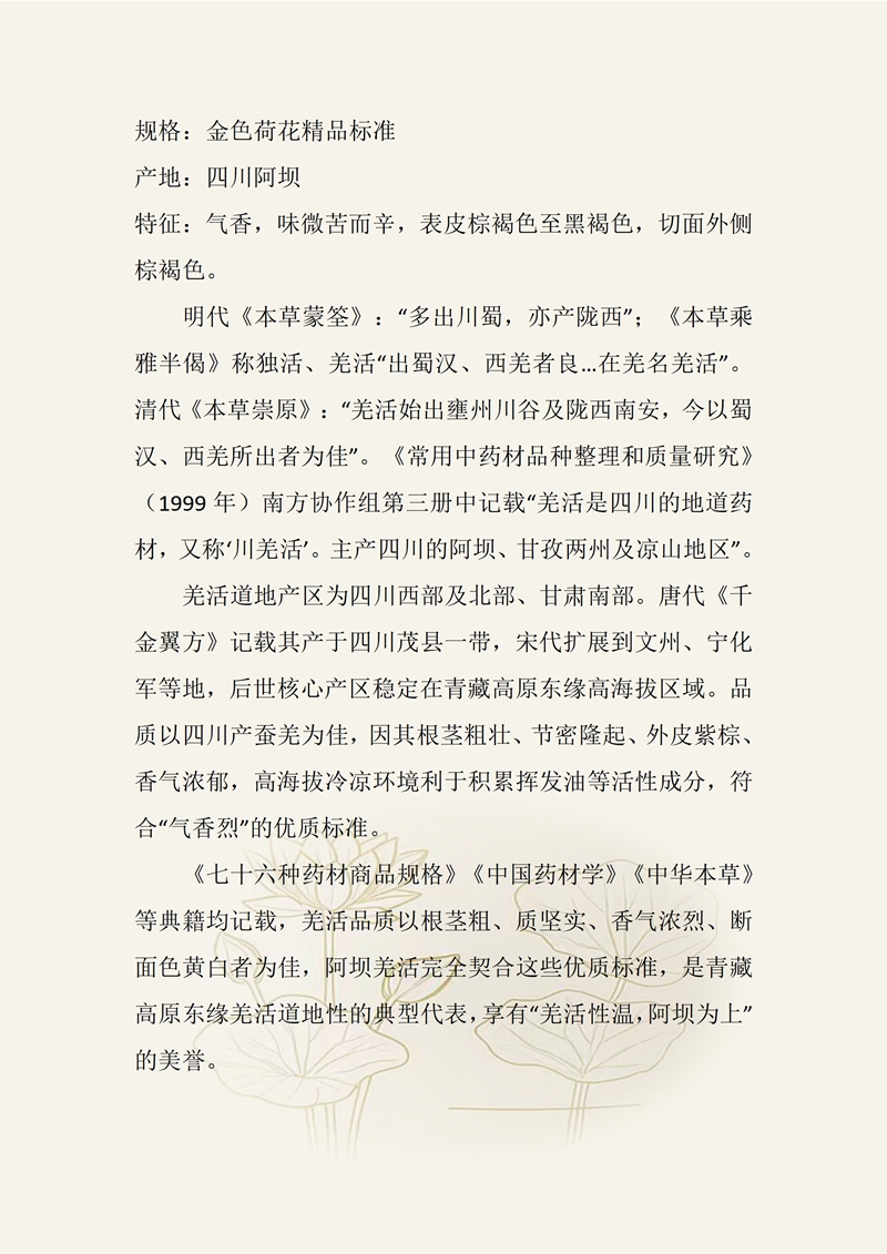 规格:金色荷花精品标准 产地:四川阿坝 特征:气香,味微苦而辛,表皮棕褐色至黑褐色,切面外侧棕褐色。 明代《本草蒙笙》:“多出川蜀,亦产陇西”;《本草乘雅半偈》称独活、羌活“出蜀汉、西羌者良..在羌名羌活”。清代《本草崇原》:“羌活始出壅州川谷及陇西南安,今以蜀汉、西羌所出者为佳”。《常用中药材品种整理和质量研究》(1999年)南方协作组第三册中记载“羌活是四川的地道药材,又称川羌活’。主产四川的阿坝、甘孜两州及凉山地区”。 羌活道地产区为四川西部及北部、甘肃南部。唐代《千金翼方》记载其产于四川茂县一带,宋代扩展到文州、宁化军等地,后世核心产区稳定在青藏高原东缘高海拔区域。品质以四川产蚕羌为佳,因其根茎粗壮、节密隆起、外皮紫棕、香气浓郁,高海拔冷凉环境利于积累挥发油等活性成分,符合“气香烈”的优质标准。 《七十六种药材商品规格》《中国药材学》《中华本草》等典籍均记载,羌活品质以根茎粗、质坚实、香气浓烈、断面色黄白者为佳,阿坝羌活完全契合这些优质标准,是青藏高原东缘羌活道地性的典型代表,享有“羌活性温,阿坝为上”的美誉。