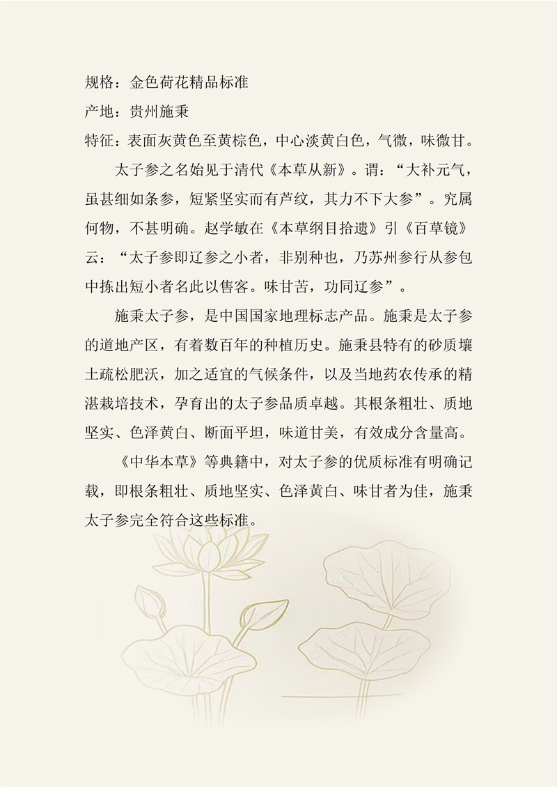 规格:金色荷花精品标准 产地:贵州施秉 特征:表面灰黄色至黄棕色,中心淡黄白色,气微,味微甘。 太子参之名始见于清代《本草从新》。谓:“大补元气,虽甚细如条参,短紧坚实而有芦纹,其力不下大参”。究属何物,不甚明确。赵学敏在《本草纲目拾遗》引《百草镜》云:“太子参即辽参之小者,非别种也,乃苏州参行从参包中拣出短小者名此以售客。味甘苦,功同辽参”。 施秉太子参,是中国国家地理标志产品。施秉是太子参的道地产区,有着数百年的种植历史。施秉县特有的砂质壤土疏松肥沃,加之适宜的气候条件,以及当地药农传承的精湛栽培技术,孕育出的太子参品质卓越。其根条粗壮、质地坚实、色泽黄白、断面平坦,味道甘美,有效成分含量高。 《中华本草》等典籍中,对太子参的优质标准有明确记载,即根条粗壮、质地坚实、色泽黄白、味甘者为佳,施秉太子参完全符合这些标准。