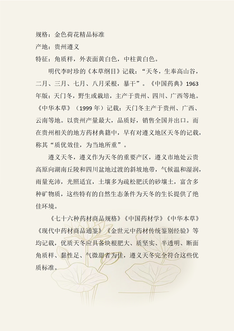 《七十六种药材商品规格》《中国药材学》《中华本草》《现代中药材商品通鉴》《金世元中药材传统鉴别经验》等均记载,优质天冬应具备块根肥大、质坚实、半透明、断面角质样、黏性足、气微甜者为佳,遵义天冬完全符合这些优质标准。