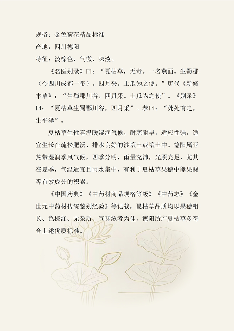 规格:金色荷花精品标准 产地:四川德阳 特征:淡棕色,气微,味淡。 《名医别录》曰:“夏枯草,无毒。一名燕面。生蜀郡(今四川成都一带)。四月采。土瓜为之使。”唐代《新修本草》:“生蜀郡川谷,四月采。土瓜为之使”。《别录》曰:“夏枯草生蜀郡川谷,四月采”。恭曰:“处处有之,生平泽”。 夏枯草生性喜温暖湿润气候,耐寒耐旱,适应性强,适宜生长在疏松肥沃、排水良好的沙壤土或壤土中。德阳属亚热带湿润季风气候,四季分明,雨量充沛,光照充足,尤其在夏季,气温适宜且雨水集中,有利于夏枯草果穗中熊果酸等有效成分的积累。 《中国药典》《中药材商品规格等级》《中药志》《金世元中药材传统鉴别经验》等记载,夏枯草品质均以果穗粗长、色棕红、无杂质、气味浓者为佳,德阳所产夏枯草多符合上述优质标准。