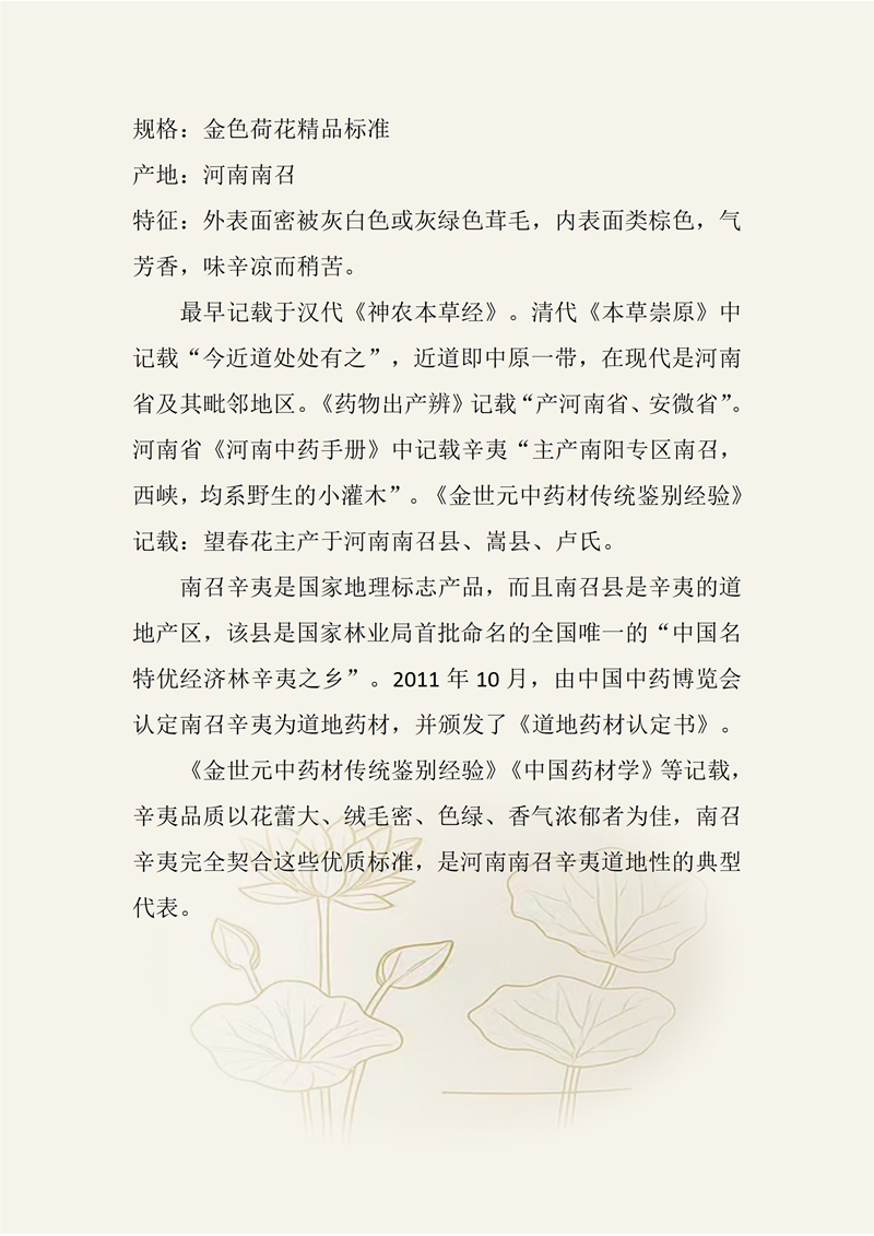 规格:金色荷花精品标准 产地:河南南召 特征:外表面密被灰白色或灰绿色茸毛,内表面类棕色,气芳香,味辛凉而稍苦。 最早记载于汉代《神农本草经》。清代《本草崇原》中记载“今近道处处有之”,近道即中原一带,在现代是河南省及其毗邻地区。《药物出产辨》记载“产河南省、安微省”。河南省《河南中药手册》中记载辛夷“主产南阳专区南召,西峡,均系野生的小灌木”。《金世元中药材传统鉴别经验》记载:望春花主产于河南南召县、嵩县、卢氏。 南召辛夷是国家地理标志产品,而且南召县是辛夷的道地产区,该县是国家林业局首批命名的全国唯一的“中国名特优经济林辛夷之乡”。2011年10月,由中国中药博览会认定南召辛夷为道地药材,并颁发了《道地药材认定书》。 《金世元中药材传统鉴别经验》《中国药材学》等记载,辛夷品质以花蕾大、绒毛密、色绿、香气浓郁者为佳,南召辛夷完全契合这些优质标准,是河南南召辛夷道地性的典型代表。