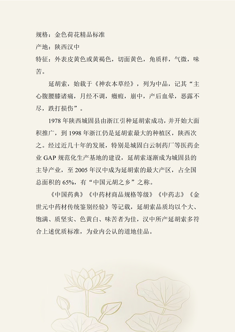 规格:金色荷花精品标准 产地:陕西汉中 特征:外表皮黄色或黄褐色,切面黄色,角质样,气微,味苦。 延胡索,始载于《神农本草经》,列为中品,记其“主心腹腰膝诸痛,月经不调,癥瘕,崩中,产后血晕,恶露不尽,跌打损伤”。 1978年陕西城固县由浙江引种延胡索成功,并开始大面积推广,到1998年浙江仍是延胡索最大的种植区,陕西次之。经过近几十年的发展,特别是城固白云制药厂等医药企业GAP规范化生产基地的建设,延胡索逐渐成为城固县的主导产业,至2005年汉中成为延胡索的最大产区,占全国总面积的65%,有“中国元胡之乡”之称。 《中国药典》《中药材商品规格等级》《中药志》《金世元中药材传统鉴别经验》等记载,延胡索品质均以个大、饱满、质坚实、色黄白、味苦者为佳,汉中所产延胡索多符合上述优质标准,为业内公认的道地佳品。