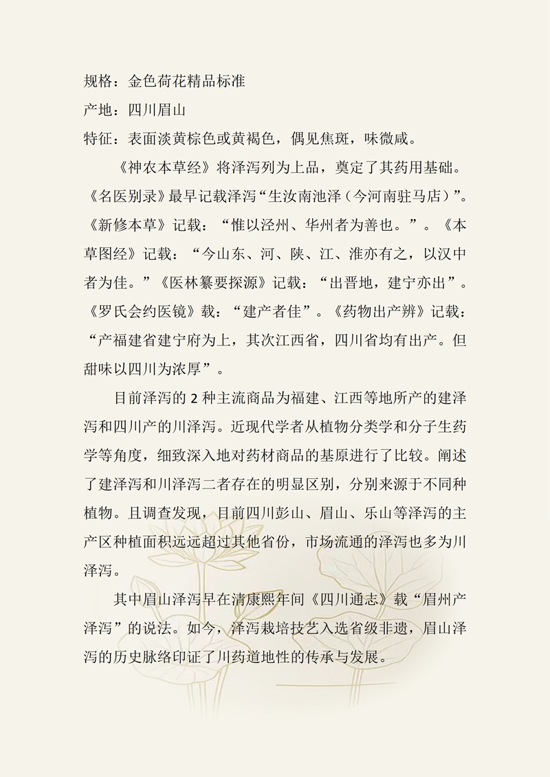 规格:金色荷花精品标准 产地:四川眉山 特征:表面淡黄棕色或黄褐色,偶见焦斑,味微咸。 《神农本草经》将泽泻列为上品,奠定了其药用基础。《名医别录》最早记载泽泻“生汝南池泽(今河南驻马店)”。《新修本草》记载:“惟以泾州、华州者为善也。”。《本草图经》记载:“今山东、河、陕、江、淮亦有之,以汉中者为佳。”《医林纂要探源》记载:“出晋地,建宁亦出”。《罗氏会约医镜》载:“建产者佳”。《药物出产辨》记载:“产福建省建宁府为上,其次江西省,四川省均有出产。但甜味以四川为浓厚”。 目前泽泻的2种主流商品为福建、江西等地所产的建泽泻和四川产的川泽泻。近现代学者从植物分类学和分子生药学等角度,细致深入地对药材商品的基原进行了比较。阐述了建泽泻和川泽泻二者存在的明显区别,分别来源于不同种植物。且调查发现,目前四川彭山、眉山、乐山等泽泻的主产区种植面积远远超过其他省份,市场流通的泽泻也多为川泽泻。 其中眉山泽泻早在清康熙年间《四川通志》载“眉州产泽泻”的说法。如今,泽泻栽培技艺入选省级非遗,眉山泽泻的历史脉络印证了川药道地性的传承与发展。