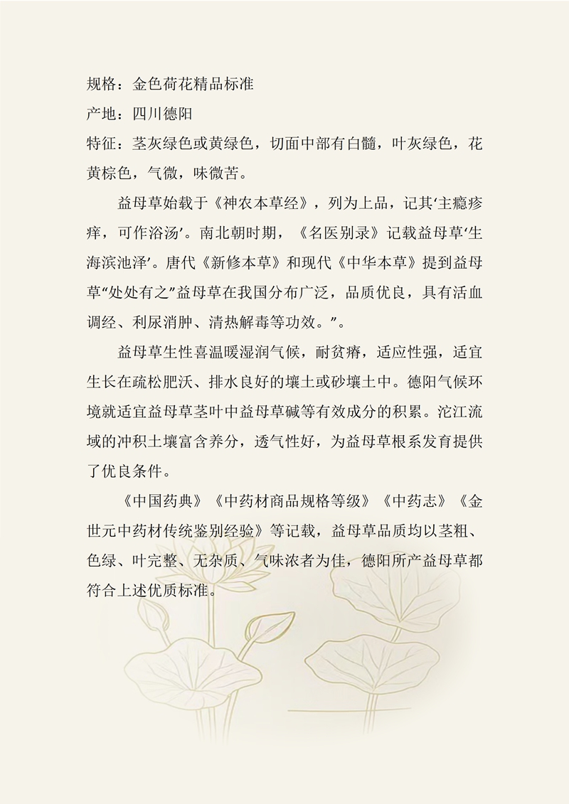 规格:金色荷花精品标准 产地:四川德阳 特征:茎灰绿色或黄绿色,切面中部有白髓,叶灰绿色,花黄棕色,气微,味微苦。 益母草始载于《神农本草经》,列为上品,记其‘主瘾疹痒,可作浴汤’。南北朝时期,《名医别录》记载益母草‘生海滨池泽’。唐代《新修本草》和现代《中华本草》提到益母草“处处有之”益母草在我国分布广泛,品质优良,具有活血调经、利尿消肿、清热解毒等功效。”。 益母草生性喜温暖湿润气候,耐贫瘠,适应性强,适宜生长在疏松肥沃、排水良好的壤土或砂壤土中。德阳气候环境就适宜益母草茎叶中益母草碱等有效成分的积累。沱江流域的冲积土壤富含养分,透气性好,为益母草根系发育提供了优良条件。 《中国药典》《中药材商品规格等级》《中药志》《金世元中药材传统鉴别经验》等记载,益母草品质均以茎粗、色绿、叶完整、无杂质、气味浓者为佳,德阳所产益母草都符合上述优质标准。
