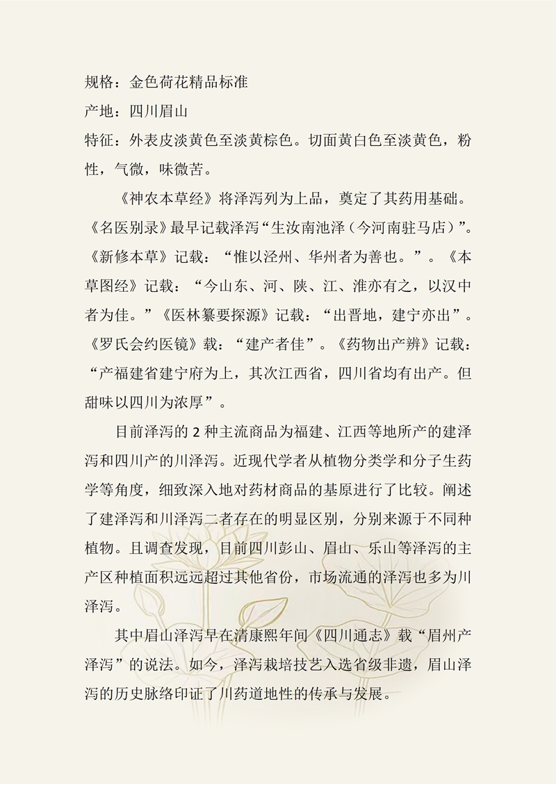 规格:金色荷花精品标准 产地:四川眉山 特征:外表皮淡黄色至淡黄棕色。切面黄白色至淡黄色,粉性,气微,味微苦。 《神农本草经》将泽泻列为上品,奠定了其药用基础。《名医别录》最早记载泽泻“生汝南池泽(今河南驻马店)”。《新修本草》记载:“惟以泾州、华州者为善也。”。《本草图经》记载:“今山东、河、陕、江、淮亦有之,以汉中者为佳。”《医林纂要探源》记载:“出晋地,建宁亦出”。《罗氏会约医镜》载:“建产者佳”。《药物出产辨》记载:“产福建省建宁府为上,其次江西省,四川省均有出产。但甜味以四川为浓厚”。 目前泽泻的2种主流商品为福建、江西等地所产的建泽泻和四川产的川泽泻。近现代学者从植物分类学和分子生药学等角度,细致深入地对药材商品的基原进行了比较。阐述了建泽泻和川泽泻二者存在的明显区别,分别来源于不同种没有经验,最首要的植物。且调查发现,目前四川彭山、眉山、乐山等泽泻的主产区种植面积远远超过其他省份,市场流通的泽泻也多为川泽泻。叶星时并 其中眉山泽泻早在清康熙年间《四川通志》载“眉州产泽泻”的说法。如今,泽泻栽培技艺入选省级非遗,眉山泽泻的历史脉络印证了川药道地性的传承与发展。
