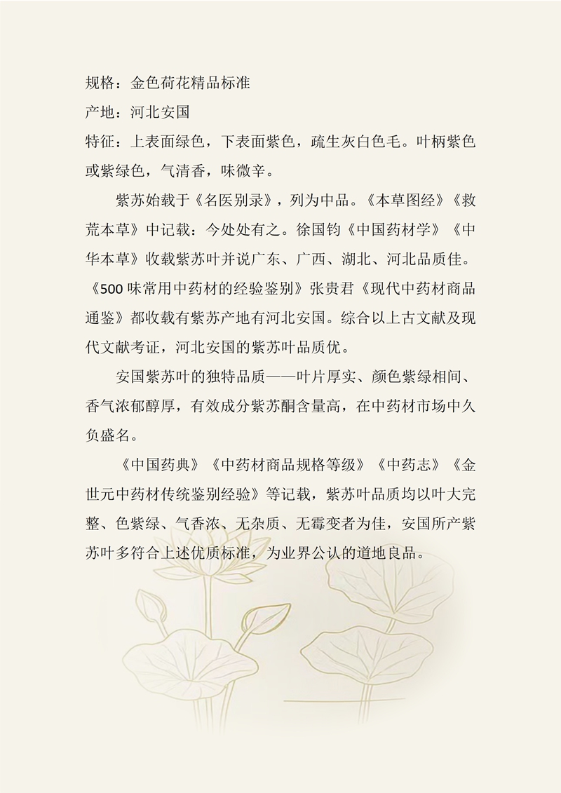 规格:金色荷花精品标准 产地:河北安国 特征:上表面绿色,下表面紫色,疏生灰白色毛。叶柄紫色或紫绿色,气清香,味微辛。 紫苏始载于《名医别录》,列为中品。《本草图经》《救荒本草》中记载:今处处有之。徐国钧《中国药材学》《中华本草》收载紫苏叶并说广东、广西、湖北、河北品质佳。《500味常用中药材的经验鉴别》张贵君《现代中药材商品通鉴》都收载有紫苏产地有河北安国。综合以上古文献及现代文献考证,河北安国的紫苏叶品质优。 安国紫苏叶的独特品质——叶片厚实、颜色紫绿相间、香气浓郁醇厚,有效成分紫苏酮含量高,在中药材市场中久负盛名。 《中国药典》《中药材商品规格等级》《中药志》《金世元中药材传统鉴别经验》等记载,紫苏叶品质均以叶大完整、色紫绿、气香浓、无杂质、无霉变者为佳,安国所产紫苏叶多符合上述优质标准,为业界公认的道地良品。