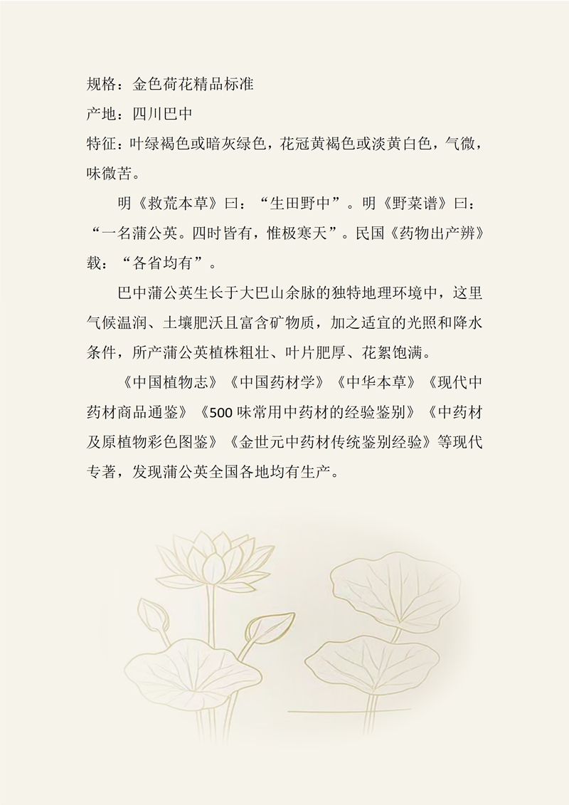 规格:金色荷花精品标准 产地:四川巴中 特征:叶绿褐色或暗灰绿色,花冠黄褐色或淡黄白色,气微,味微苦。 明《救荒本草》曰:“生田野中”。明《野菜谱》曰:“一名蒲公英。四时皆有,惟极寒天”。民国《药物出产辨》载:“各省均有”。 巴中蒲公英生长于大巴山余脉的独特地理环境中,这里气候温润、土壤肥沃且富含矿物质,加之适宜的光照和降水条件,所产蒲公英植株粗壮、叶片肥厚、花絮饱满。 《中国植物志》《中国药材学》《中华本草》《现代中药材商品通鉴》《500味常用中药材的经验鉴别》《中药材及原植物彩色图鉴》《金世元中药材传统鉴别经验》等现代专著,发现蒲公英全国各地均有生产。