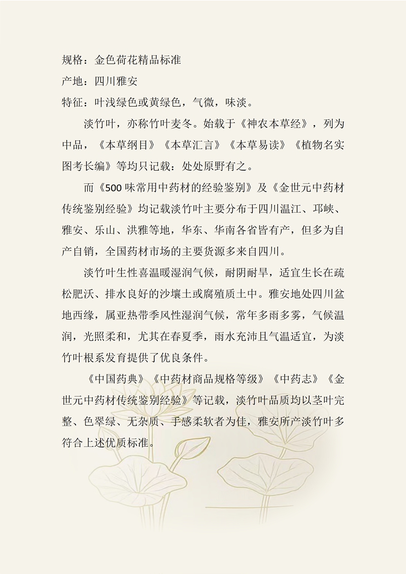 《中国药典》《中药材商品规格等级》《中药志》《金世元中药材传统鉴别经验》等记载,淡竹叶品质均以茎叶完整、色翠绿、无杂质、手感柔软者为佳,雅安所产淡竹叶多符合上述优质标准。