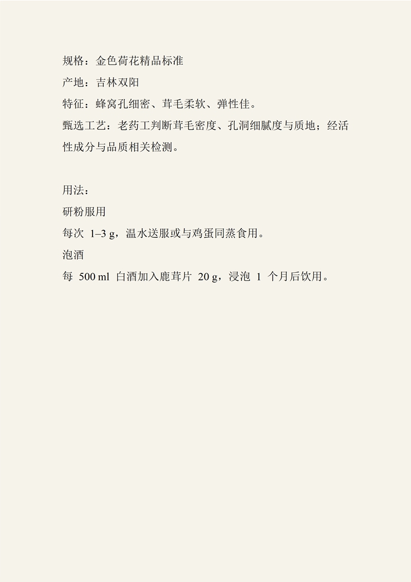 规格:金色荷花精品标准 产地:吉林双阳 特征:蜂窝孔细密、茸毛柔软、弹性佳。 甄选工艺:老药工判断茸毛密度、孔洞细腻度与质地;经活性成分与品质相关检测。