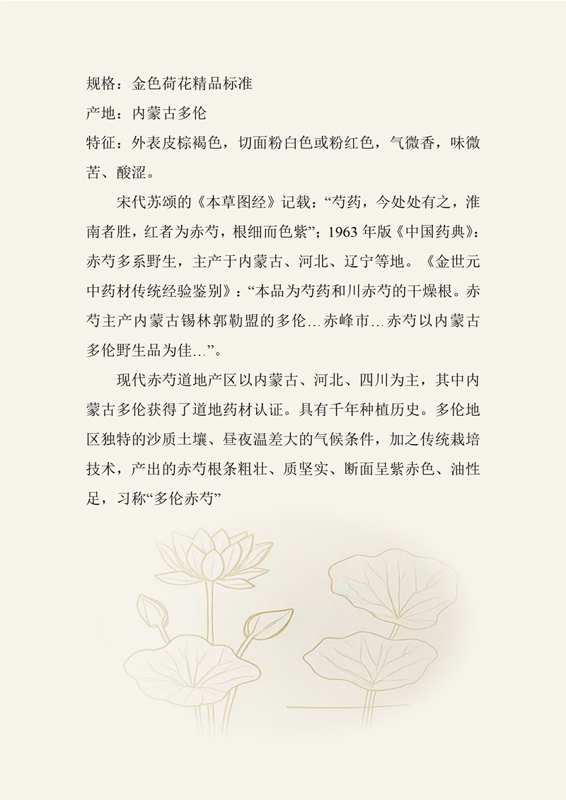 规格:金色荷花精品标准 产地:内蒙古多伦 特征:外表皮棕褐色,切面粉白色或粉红色,气微香,味微苦、酸涩。 宋代苏颂的《本草图经》记载:“芍药,今处处有之,淮南者胜,红者为赤芍,根细而色紫”;1963年版《中国药典》:赤芍多系野生,主产于内蒙古、河北、辽宁等地。《金世元中药材传统经验鉴别》:“本品为芍药和川赤芍的干燥根。赤芍主产内蒙古锡林郭勒盟的多伦.赤峰市 赤芍以内蒙古多伦野生品为佳”。 现代赤芍道地产区以内蒙古、河北、四川为主,其中内蒙古多伦获得了道地药材认证。具有千年种植历史。多伦地区独特的沙质土壤、昼夜温差大的气候条件,加之传统栽培技术,产出的赤芍根条粗壮、质坚实、断面呈紫赤色、油性足,习称“多伦赤芍”