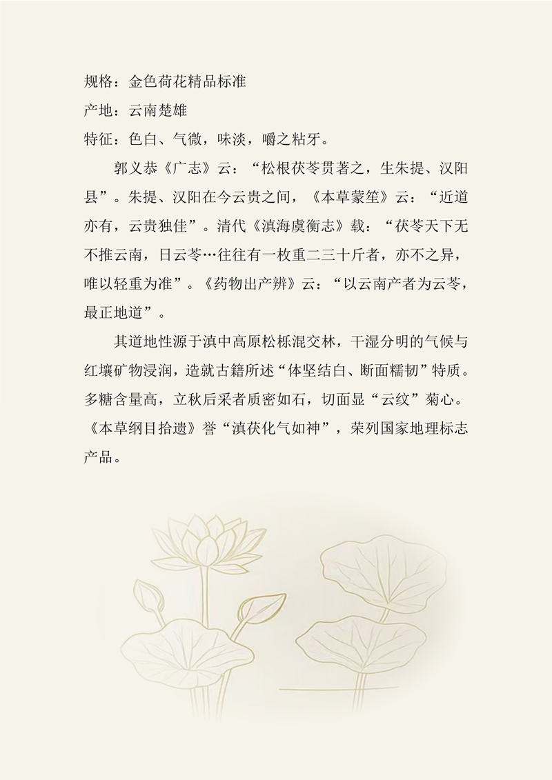 其道地性源于滇中高原松栎混交林,干湿分明的气候与红壤矿物浸润,造就古籍所述“体坚结白、断面糯韧”特质。多糖含量高,立秋后采者质密如石,切面显“云纹”菊心。《本草纲目拾遗》誉“滇茯化气如神”,荣列国家地理标志产品。