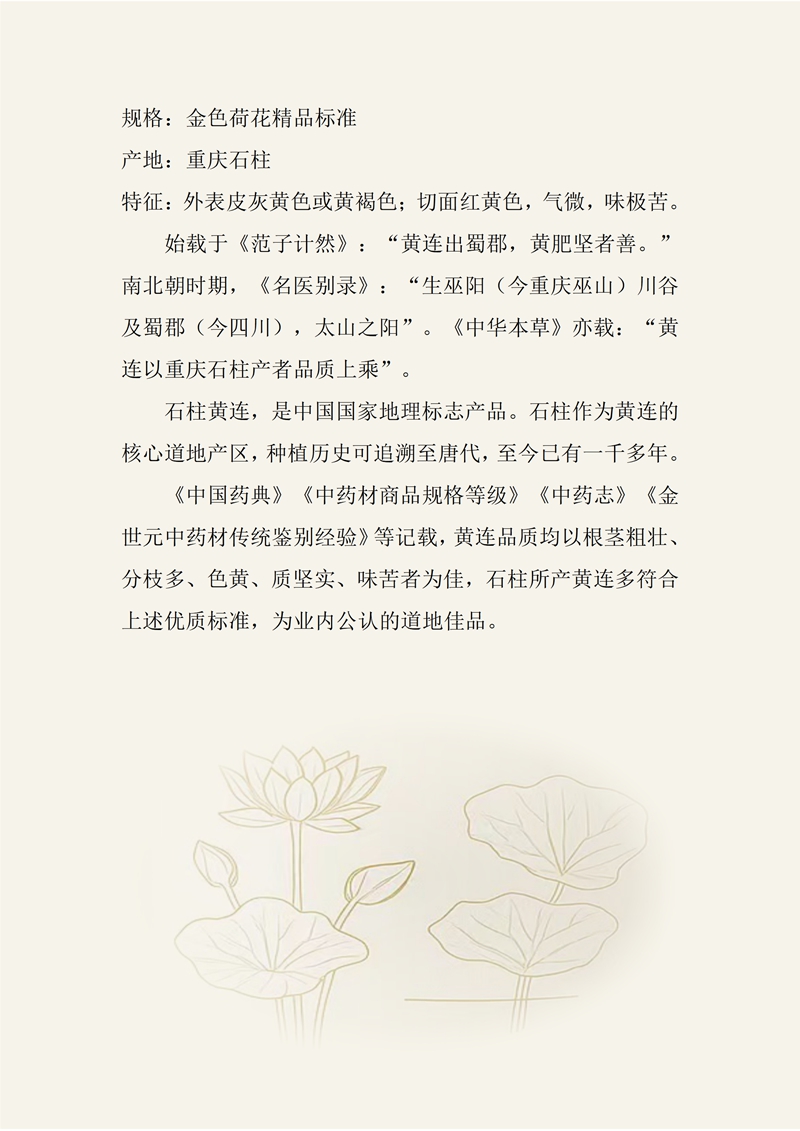 规格:金色荷花精品标准 产地:重庆石柱 特征:外表皮灰黄色或黄褐色;切面红黄色,气微,味极苦。 始载于《范子计然》:“黄连出蜀郡,黄肥坚者善。”南北朝时期,《名医别录》:“生巫阳(今重庆巫山)川谷及蜀郡(今四川),太山之阳”。《中华本草》亦载:“黄连以重庆石柱产者品质上乘”。 石柱黄连,是中国国家地理标志产品。石柱作为黄连的核心道地产区,种植历史可追溯至唐代,至今已有一千多年。 《中国药典》《中药材商品规格等级》《中药志》《金世元中药材传统鉴别经验》等记载,黄连品质均以根茎粗壮、分枝多、色黄、质坚实、味苦者为佳,石柱所产黄连多符合上述优质标准,为业内公认的道地佳品。