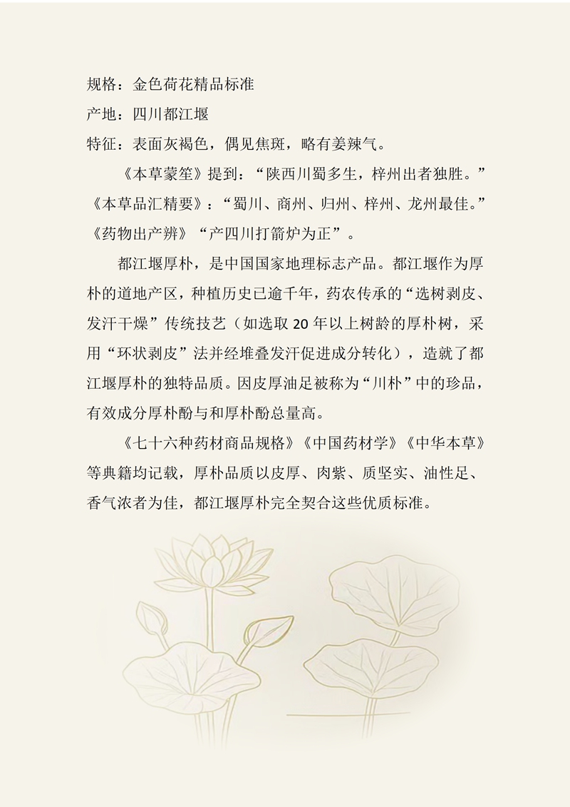 规格:金色荷花精品标准 产地:四川都江堰 特征:表面灰褐色,偶见焦斑,略有姜辣气。 《本草蒙笙》提到:“陕西川蜀多生,梓州出者独胜。”《本草品汇精要》:“蜀川、商州、归州、梓州、龙州最佳。”《药物出产辨》“产四川打箭炉为正”。 都江堰厚朴,是中国国家地理标志产品。都江堰作为厚朴的道地产区,种植历史已逾千年,药农传承的“选树剥皮、发汗干燥”传统技艺(如选取20年以上树龄的厚朴树,采用“环状剥皮”法并经堆叠发汗促进成分转化),造就了都江堰厚朴的独特品质。因皮厚油足被称为“川朴”中的珍品,有效成分厚朴酚与和厚朴酚总量高。 《七十六种药材商品规格》《中国药材学》《中华本草》等典籍均记载,厚朴品质以皮厚、肉紫、质坚实、油性足、香气浓者为佳,都江堰厚朴完全契合这些优质标准。