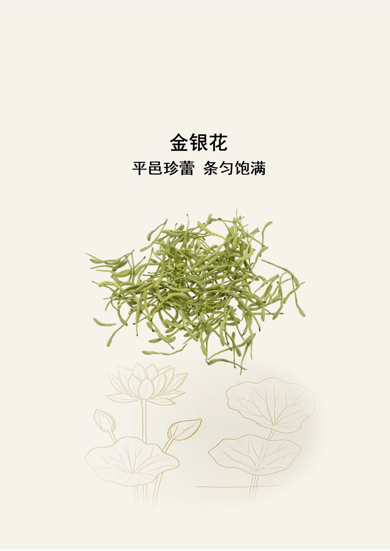 规格:金色荷花精品标准 产地:山东平邑 特征:绿白色,气清香,味淡、微苦。 1995年出版的《中国中药区划》记载“山东省是我国金银花主要传统产地之一,栽培历史近200年”;《76种药材商品规格标准》认为:“东银花:主产于山东省的平邑、费县、仓山、沂水等地”。 平邑金银花,是中国国家地理标志产品。平邑作为金银花的核心道地产区,种植历史已逾千年,素有“中国金银花之乡”的美誉。药农传承的“含苞待放时采收、阴干或烘干”传统技艺,造就了平邑金银花的独特品质。 《七十六种药材商品规格》《中国药材学》《中华本草》等典籍均记载,金银花品质以花蕾肥大、色黄白、气清香、无杂质者为佳,平邑金银花完全契合这些优质标准,是华东地区金银花道地性的典型代表。