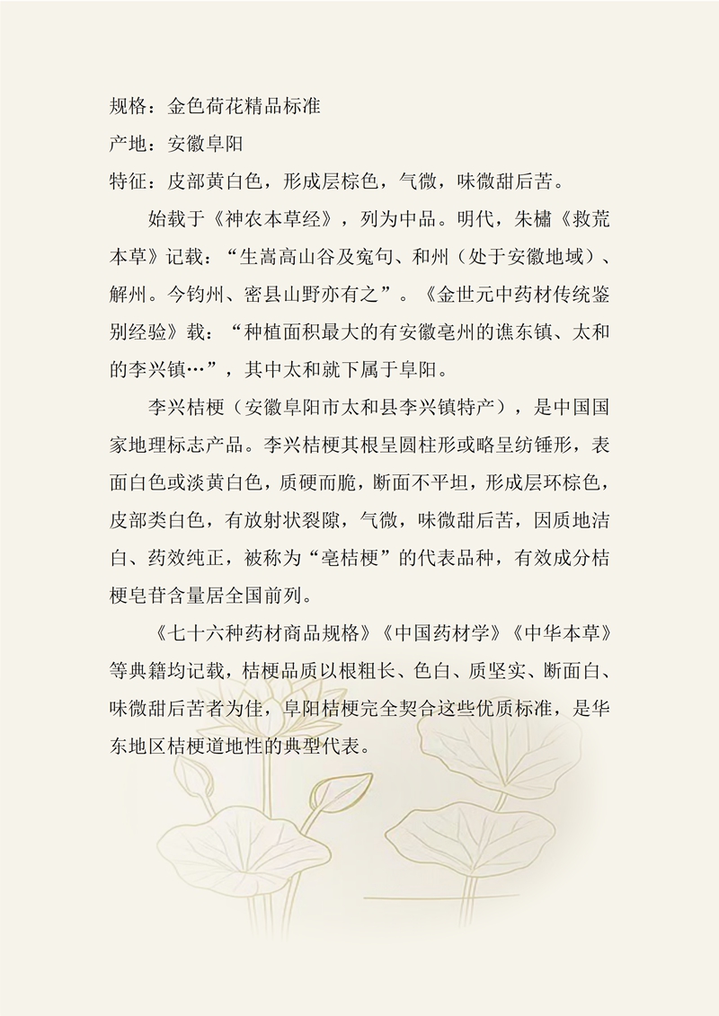 规格:金色荷花精品标准 产地:安徽阜阳 特征:皮部黄白色,形成层棕色,气微,味微甜后苦。 始载于《神农本草经》,列为中品。明代,朱楠《救荒本草》记载:“生嵩高山谷及冤句、和州(处于安徽地域)、解州。今钧州、密县山野亦有之”。《金世元中药材传统鉴别经验》载:“种植面积最大的有安徽亳州的谯东镇、太和的李兴镇…”,其中太和就下属于阜阳。 李兴桔梗(安徽阜阳市太和县李兴镇特产),是中国国家地理标志产品。李兴桔梗其根呈圆柱形或略呈纺锤形,表面白色或淡黄白色,质硬而脆,断面不平坦,形成层环棕色,皮部类白色,有放射状裂隙,气微,味微甜后苦,因质地洁白、药效纯正,被称为“亳桔梗”的代表品种,有效成分桔梗皂苷含量居全国前列。 《七十六种药材商品规格》《中国药材学》《中华本草》等典籍均记载,桔梗品质以根粗长、色白、质坚实、断面白、味微甜后苦者为佳,阜阳桔梗完全契合这些优质标准,是华东地区桔梗道地性的典型代表。