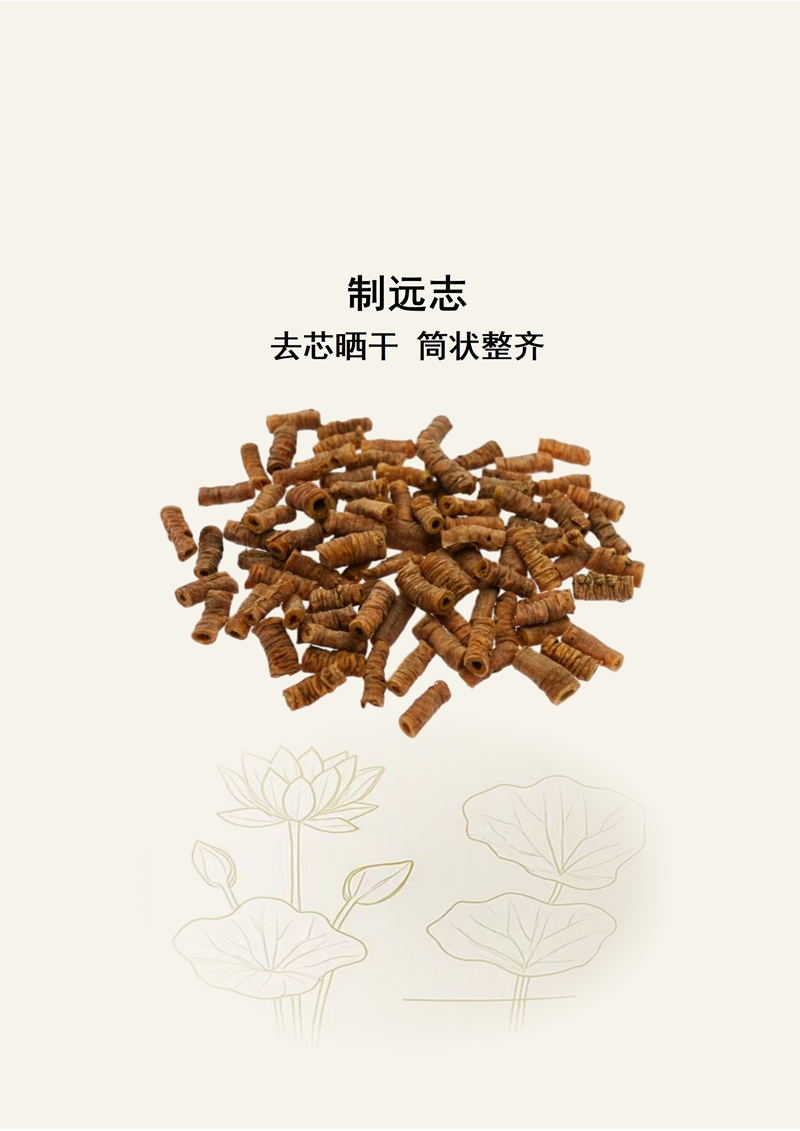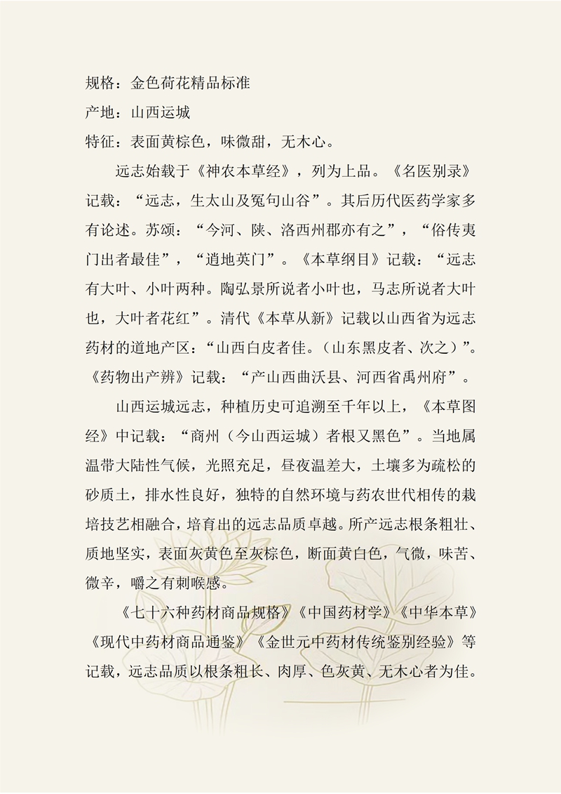 规格:金色荷花精品标准 产地:山西运城 特征:表面黄棕色,味微甜,无木心。 远志始载于《神农本草经》,列为上品。《名医别录》记载:“远志,生太山及冤句山谷”。其后历代医药学家多有论述。苏颂:“今河、陕、洛西州郡亦有之”,“俗传夷门出者最佳”,“逍地英门”。《本草纲目》记载:“远志有大叶、小叶两种。陶弘景所说者小叶也,马志所说者大叶也,大叶者花红”。清代《本草从新》记载以山西省为远志药材的道地产区:“山西白皮者佳。(山东黑皮者、次之)”。《药物出产辨》记载:“产山西曲沃县、河西省禹州府”。 山西运城远志,种植历史可追溯至千年以上,《本草图经》中记载:“商州(今山西运城)者根又黑色”。当地属温带大陆性气候,光照充足,昼夜温差大,土壤多为疏松的砂质土,排水性良好,独特的自然环境与药农世代相传的栽培技艺相融合,培育出的远志品质卓越。所产远志根条粗壮、质地坚实,表面灰黄色至灰棕色,断面黄白色,气微,味苦、微辛,嚼之有刺喉感。《七十六种药材商品规格》《中国药材学》《中华本草》形《现代中药材商品通鉴》《金世元中药材传统鉴别经验》等记载,远志品质以根条粗长、肉厚、色灰黄、无木心者为佳。