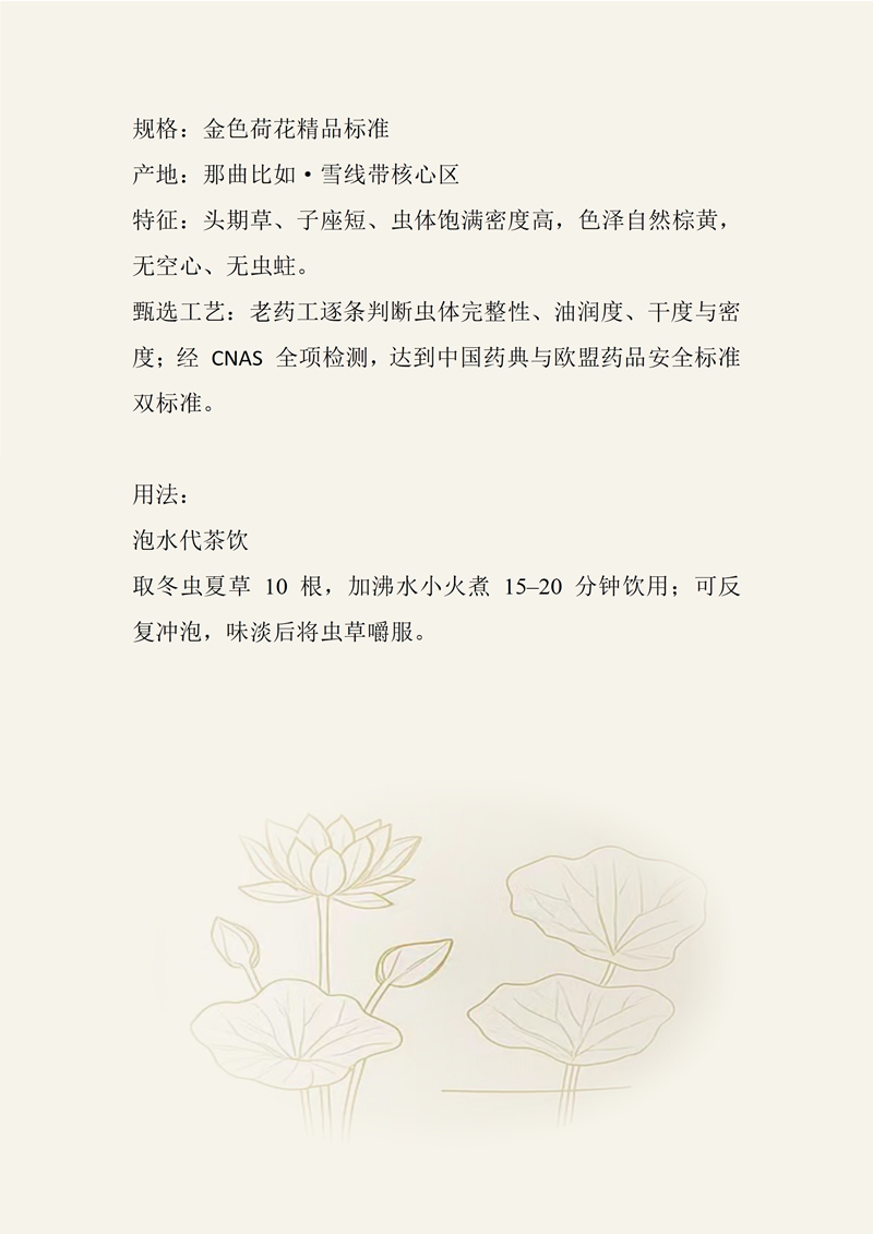规格:金色荷花精品标准 产地:那曲比如·雪线带核心区 特征:头期草、子座短、虫体饱满密度高,色泽自然棕黄,无空心、无虫蛀。 甄选工艺:老药工逐条判断虫体完整性、油润度、干度与密度;经CNAS全项检测,达到中国药典与欧盟药品安全标准双标准。