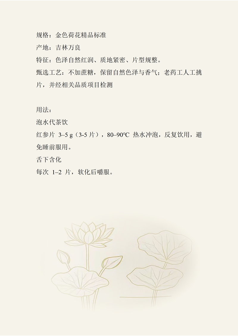 规格:金色荷花精品标准 产地:吉林万良 特征:色泽自然红润、质地紧密、片型规整。甄选工艺:不加蔗糖,保留自然色泽与香气;老药工人工挑片,并经相关品质项目检测