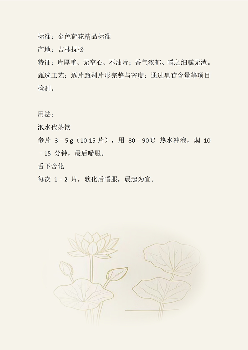 标准:金色荷花精品标准 产地:吉林抚松 特征:片厚重、无空心、不油片;香气浓郁、嚼之细腻无渣。甄选工艺:逐片甄别片形完整与密度;通过皂苷含量等项目检测。