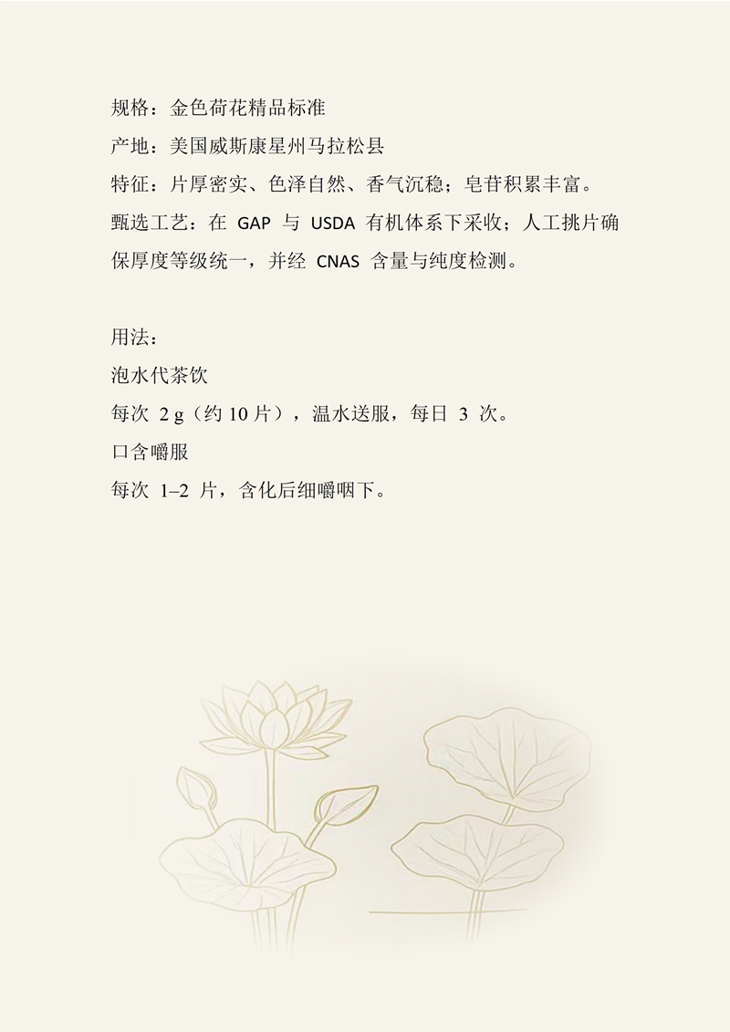 规格:金色荷花精品标准 产地:美国威斯康星州马拉松县特征:片厚密实、色泽自然、香气沉稳;皂苷积累丰富。甄选工艺:在GAP与 USDA有机体系下采收;人工挑片确保厚度等级统一,并经CNAS 含量与纯度检测。