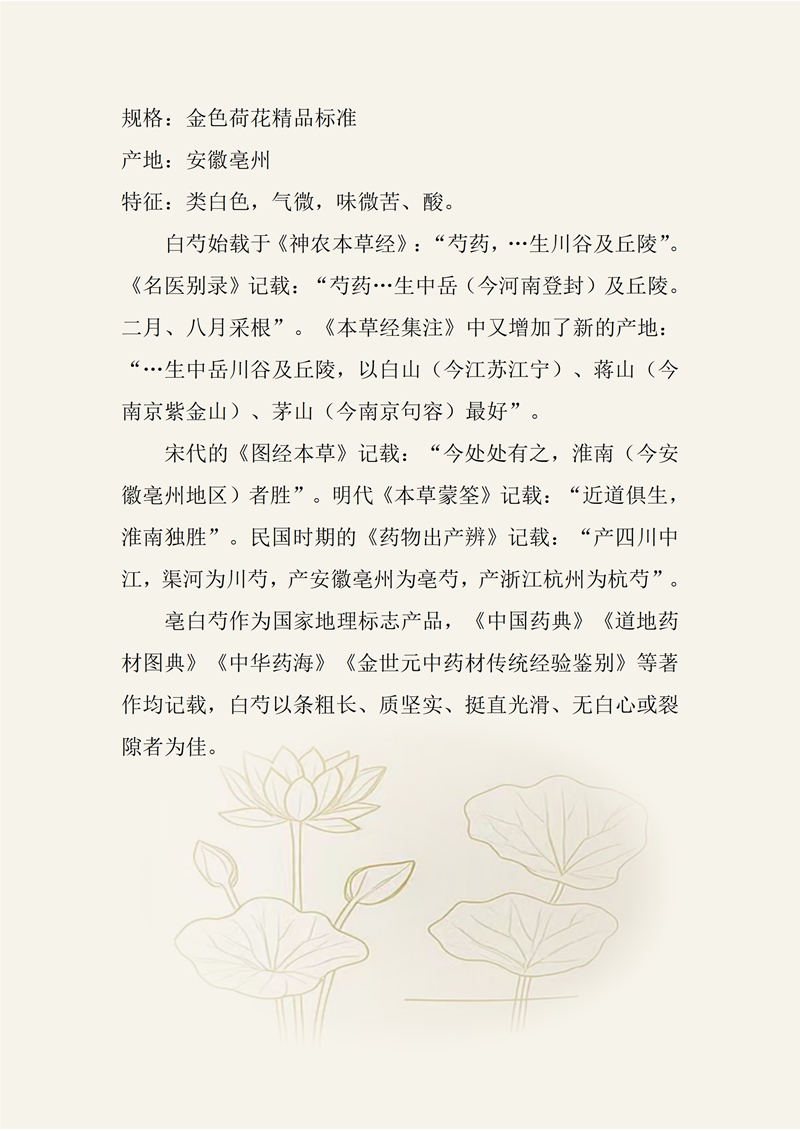 规格:金色荷花精品标准 产地:安徽亳州 特征:类白色,气微,味微苦、酸。 白芍始载于《神农本草经》:“芍药,…生川谷及丘陵”。《名医别录》记载:“芍药…生中岳(今河南登封)及丘陵。二月、八月采根”。《本草经集注》中又增加了新的产地:“…生中岳川谷及丘陵,以白山(今江苏江宁)、蒋山(今南京紫金山)、茅山(今南京句容)最好”。 宋代的《图经本草》记载:“今处处有之,淮南(今安徽亳州地区)者胜”。明代《本草蒙笙》记载:“近道俱生,淮南独胜”。民国时期的《药物出产辨》记载:“产四川中江,渠河为川芍,产安徽亳州为亳芍,产浙江杭州为杭芍”。 亳白芍作为国家地理标志产品,《中国药典》《道地药材图典》《中华药海》《金世元中药材传统经验鉴别》等著作均记载,白芍以条粗长、质坚实、挺直光滑、无白心或裂隙者为佳。