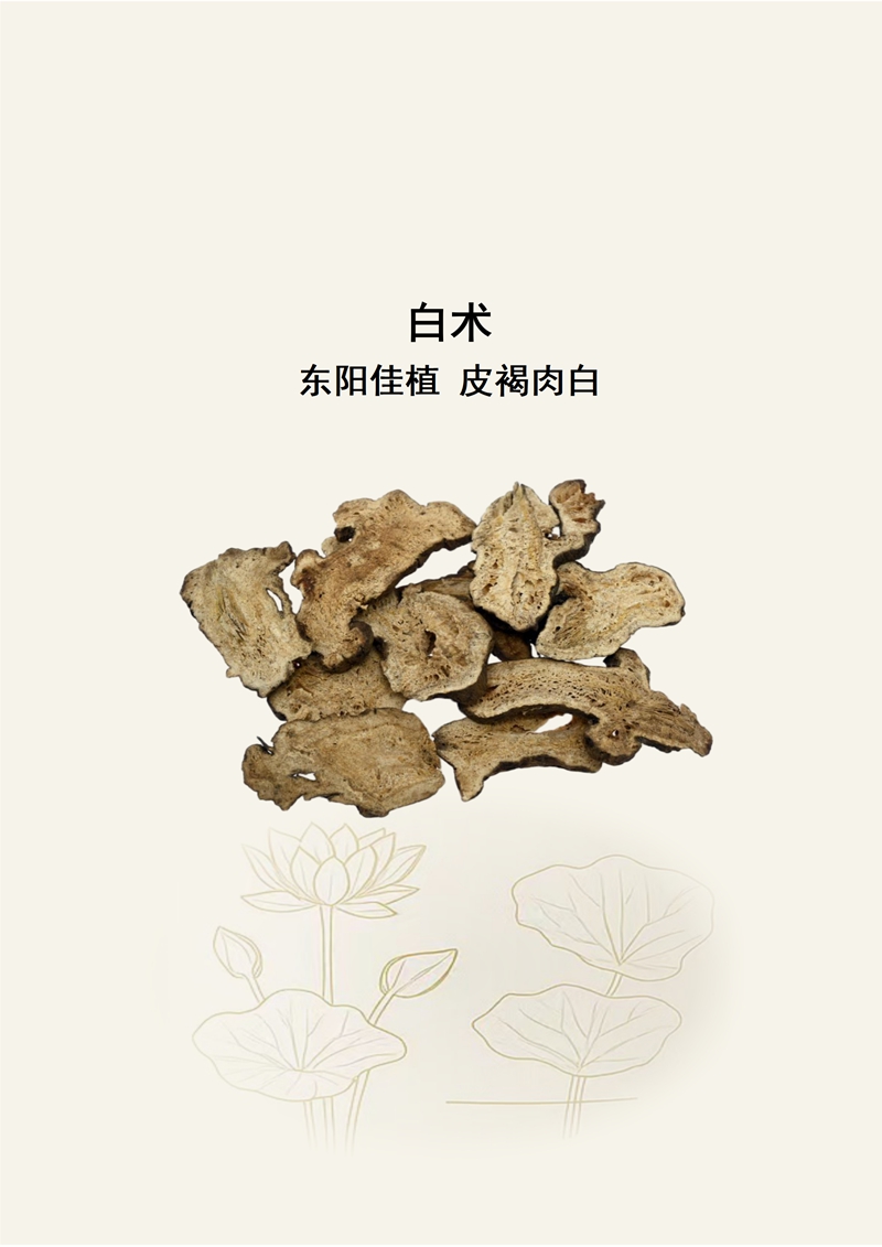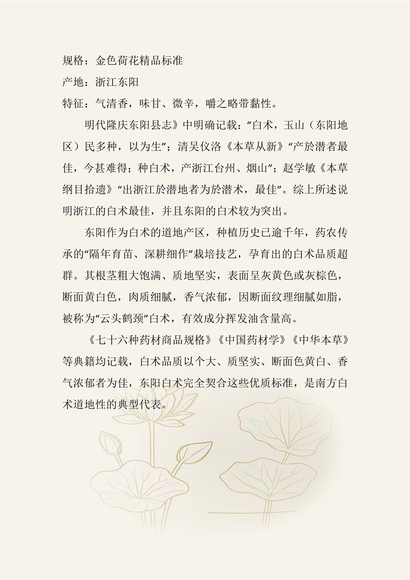 规格:金色荷花精品标准 产地:浙江东阳 特征:气清香,味甘、微辛,嚼之略带黏性。 明代隆庆东阳县志》中明确记载:“白术,玉山(东阳地区)民多种,以为生”;清吴仪洛《本草从新》“产於潜者最佳,今甚难得;种白术,产浙江台州、烟山”;赵学敏《本草纲目拾遗》“出浙江於潜地者为於潜术,最佳”。综上所述说明浙江的白术最佳,并且东阳的白术较为突出。 东阳作为白术的道地产区,种植历史已逾千年,药农传承的“隔年育苗、深耕细作”栽培技艺,孕育出的白术品质超群。其根茎粗大饱满、质地坚实,表面呈灰黄色或灰棕色,断面黄白色,肉质细腻,香气浓郁,因断面纹理细腻如脂,被称为“云头鹤颈”白术,有效成分挥发油含量高。 《七十六种药材商品规格》《中国药材学》《中华本草》等典籍均记载,白术品质以个大、质坚实、断面色黄白、香气浓郁者为佳,东阳白术完全契合这些优质标准,是南方白术道地性的典型代表。
