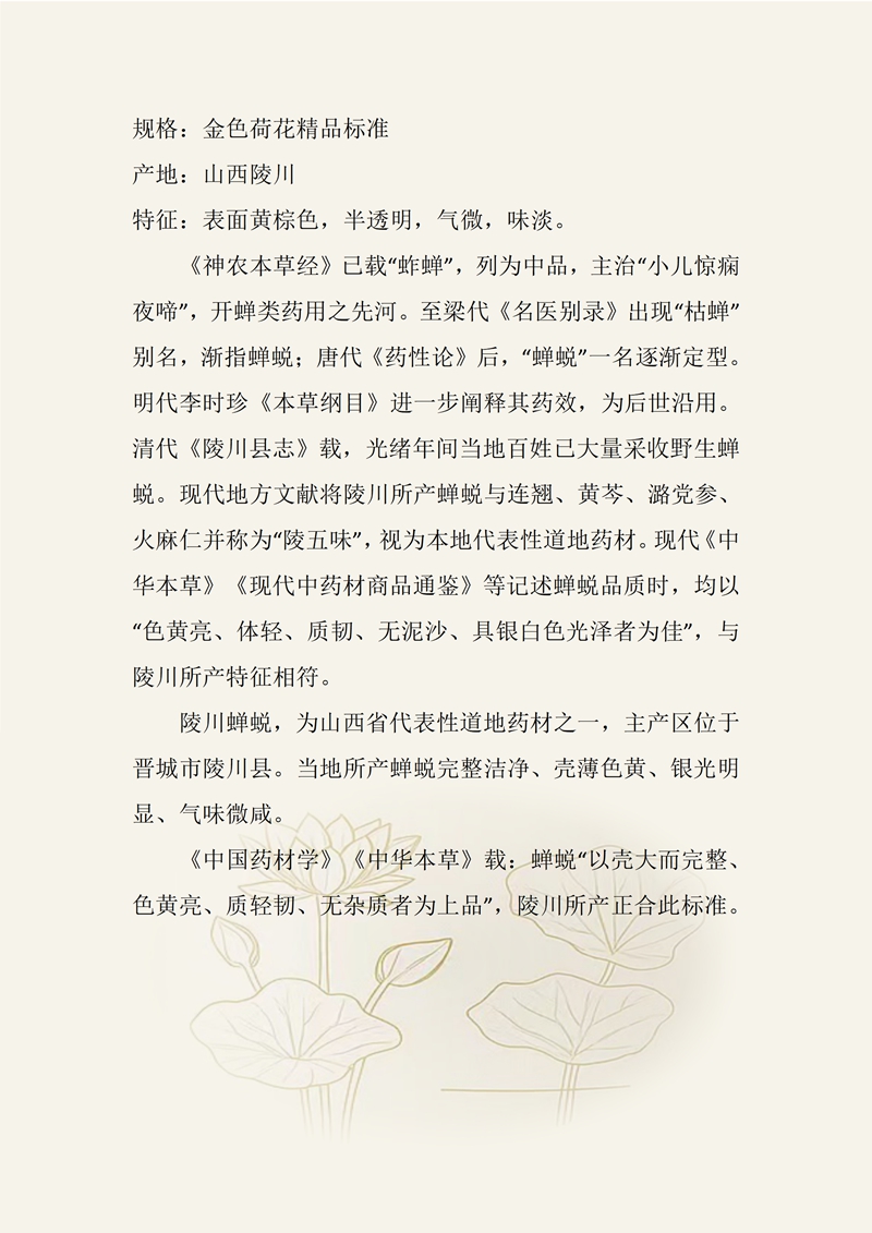 规格:金色荷花精品标准 产地:山西陵川 特征:表面黄棕色,半透明,气微,味淡。 《神农本草经》已载“蚱蝉",列为中品,主治“小儿惊痫夜啼”,开蝉类药用之先河。至梁代《名医别录》出现“枯蝉”别名,渐指蝉蜕;唐代《药性论》后,“蝉蜕”一名逐渐定型。明代李时珍《本草纲目》进一步阐释其药效,为后世沿用。清代《陵川县志》载,光绪年间当地百姓已大量采收野生蝉蜕。现代地方文献将陵川所产蝉蜕与连翘、黄芩、潞党参、火麻仁并称为“陵五味”,视为本地代表性道地药材。现代《中华本草》《现代中药材商品通鉴》等记述蝉蜕品质时,均以“色黄亮、体轻、质韧、无泥沙、具银白色光泽者为佳”,与陵川所产特征相符。 陵川蝉蜕,为山西省代表性道地药材之一,主产区位于晋城市陵川县。当地所产蝉蜕完整洁净、壳薄色黄、银光明显、气味微咸。 《中国药材学》《中华本草》载:蝉蜕“以壳大而完整、色黄亮、质轻韧、无杂质者为上品”,陵川所产正合此标准。
