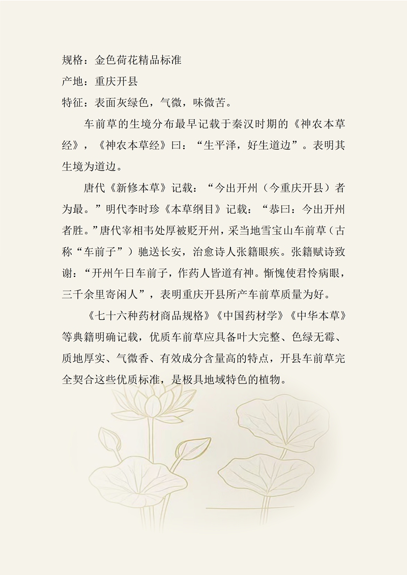 规格:金色荷花精品标准 产地:重庆开县 特征:表面灰绿色,气微,味微苦。 车前草的生境分布最早记载于秦汉时期的《神农本草经》,《神农本草经》曰:“生平泽,好生道边”。表明其生境为道边。 唐代《新修本草》记载:“今出开州(今重庆开县)者为最。”明代李时珍《本草纲目》记载:“恭曰:今出开州者胜。”唐代宰相韦处厚被贬开州,采当地雪宝山车前草(古称“车前子”)驰送长安,治愈诗人张籍眼疾。张籍赋诗致谢:“开州午日车前子,作药人皆道有神。惭愧使君怜病眼,三千余里寄闲人”,表明重庆开县所产车前草质量为好。 《七十六种药材商品规格》《中国药材学》《中华本草》等典籍明确记载,优质车前草应具备叶大完整、色绿无霉、质地厚实、气微香、有效成分含量高的特点,开县车前草完全契合这些优质标准,是极具地域特色的植物。