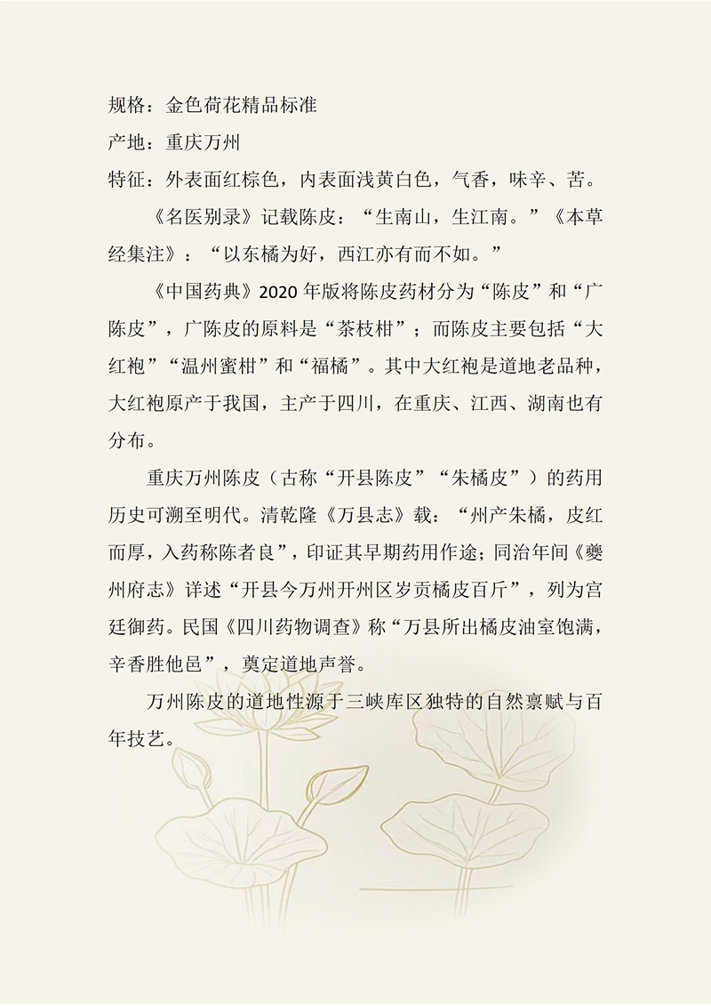规格:金色荷花精品标准 产地:重庆万州 特征:外表面红棕色,内表面浅黄白色,气香,味辛、苦。 《名医别录》记载陈皮:“生南山,生江南。”《本草经集注》:“以东橘为好,西江亦有而不如。” 《中国药典》2020年版将陈皮药材分为“陈皮”和“广陈皮”,广陈皮的原料是“茶枝柑”;而陈皮主要包括“大红袍”“温州蜜柑”和“福橘”。其中大红袍是道地老品种,大红袍原产于我国,主产于四川,在重庆、江西、湖南也有分布。 重庆万州陈皮(古称“开县陈皮”“朱橘皮”)的药用历史可溯至明代。清乾隆《万县志》载:“州产朱橘,皮红而厚,入药称陈者良”,印证其早期药用作途;同治年间《夔州府志》详述“开县今万州开州区岁贡橘皮百斤”,列为宫廷御药。民国《四川药物调查》称“万县所出橘皮油室饱满,辛香胜他邑”,奠定道地声誉。 万州陈皮的道地性源于三峡库区独特的自然禀赋与百年技艺。