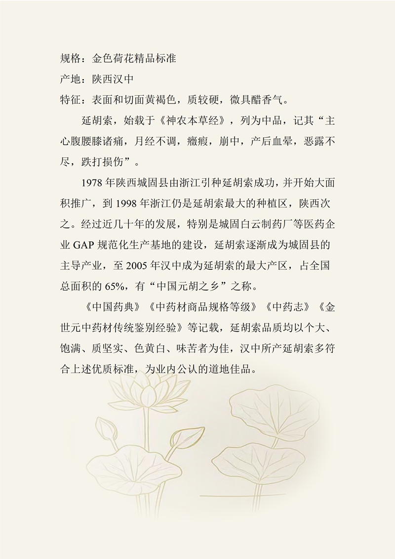 规格:金色荷花精品标准 产地:陕西汉中 特征:表面和切面黄褐色,质较硬,微具醋香气。 延胡索,始载于《神农本草经》,列为中品,记其“主心腹腰膝诸痛,月经不调,癥瘕,崩中,产后血晕,恶露不尽,跌打损伤”。 1978年陕西城固县由浙江引种延胡索成功,并开始大面积推广,到1998年浙江仍是延胡索最大的种植区,陕西次之。经过近几十年的发展,特别是城固白云制药厂等医药企业GAP规范化生产基地的建设,延胡索逐渐成为城固县的主导产业,至2005年汉中成为延胡索的最大产区,占全国总面积的65%,有“中国元胡之乡”之称。 《中国药典》《中药材商品规格等级》《中药志》《金世元中药材传统鉴别经验》等记载,延胡索品质均以个大、饱满、质坚实、色黄白、味苦者为佳,汉中所产延胡索多符合上述优质标准,为业内公认的道地佳品。