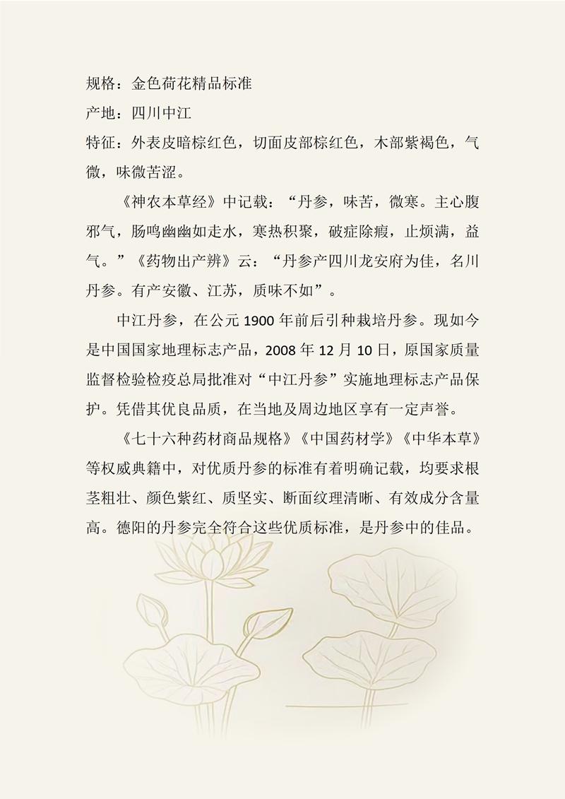 规格:金色荷花精品标准 产地:四川中江 特征:外表皮暗棕红色,切面皮部棕红色,木部紫褐色,气微,味微苦涩。 《神农本草经》中记载:“丹参,味苦,微寒。主心腹邪气,肠鸣幽幽如走水,寒热积聚,破症除瘕,止烦满,益气。”《药物出产辨》云:“丹参产四川龙安府为佳,名川丹参。有产安徽、江苏,质味不如”。 中江丹参,在公元1900年前后引种栽培丹参。现如今是中国国家地理标志产品,2008年12月10日,原国家质量监督检验检疫总局批准对“中江丹参”实施地理标志产品保护。凭借其优良品质,在当地及周边地区享有一定声誉。 《七十六种药材商品规格》《中国药材学》《中华本草》等权威典籍中,对优质丹参的标准有着明确记载,均要求根茎粗壮、颜色紫红、质坚实、断面纹理清晰、有效成分含量高。德阳的丹参完全符合这些优质标准,是丹参中的佳品。