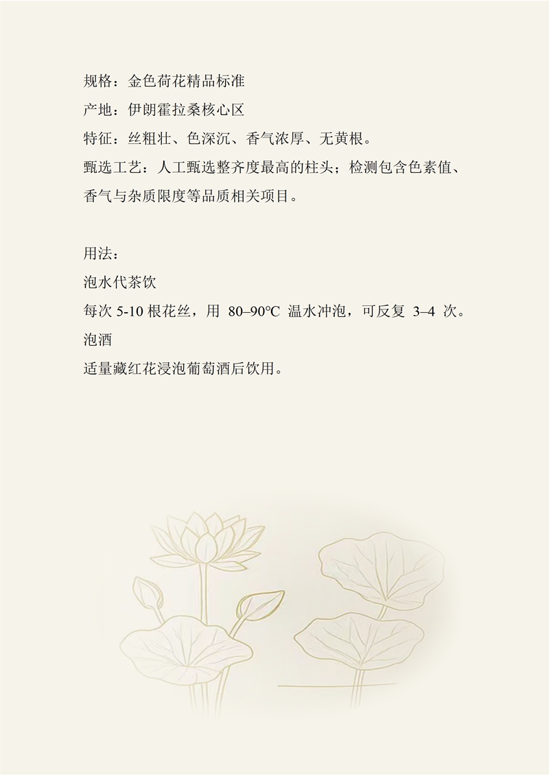 规格:金色荷花精品标准 产地:伊朗霍拉桑核心区 特征:丝粗壮、色深沉、香气浓厚、无黄根。甄选工艺:人工甄选整齐度最高的柱头;检测包含色素值、香气与杂质限度等品质相关项目。