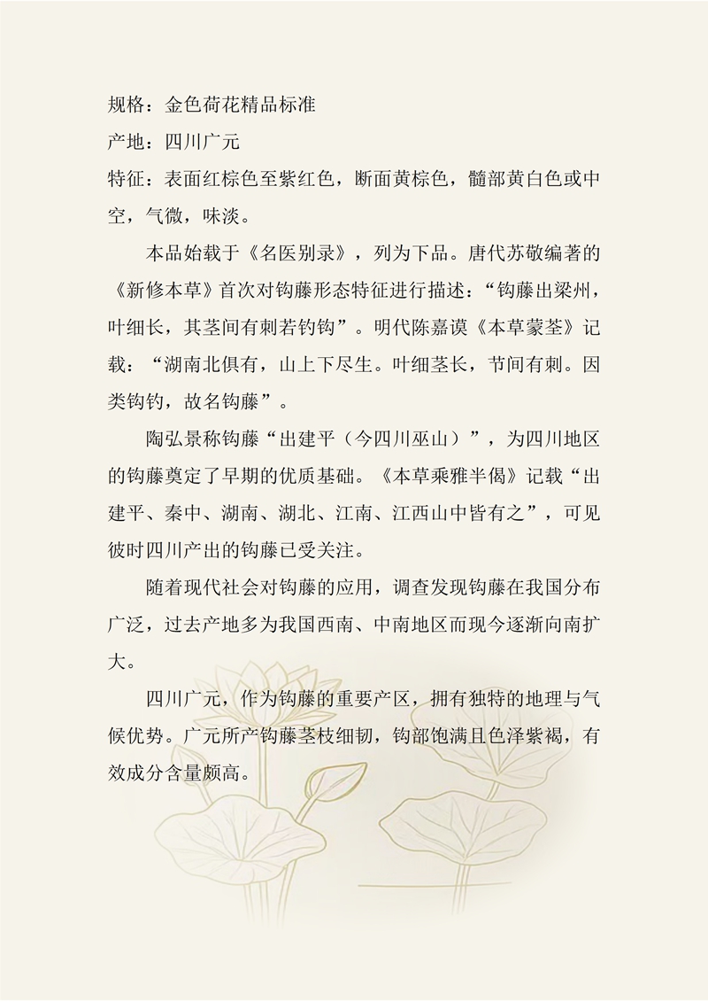 规格:金色荷花精品标准 产地:四川广元 特征:表面红棕色至紫红色,断面黄棕色,髓部黄白色或中空,气微,味淡。 本品始载于《名医别录》,列为下品。唐代苏敬编著的《新修本草》首次对钩藤形态特征进行描述:“钩藤出梁州,叶细长,其茎间有刺若钓钩”。明代陈嘉谟《本草蒙荃》记载:“湖南北俱有,山上下尽生。叶细茎长,节间有刺。因类钩钓,故名钩藤”。 陶弘景称钩藤“出建平(今四川巫山)”,为四川地区的钩藤奠定了早期的优质基础。《本草乘雅半偈》记载“出建平、秦中、湖南、湖北、江南、江西山中皆有之”,可见彼时四川产出的钩藤已受关注。 随着现代社会对钩藤的应用,调查发现钩藤在我国分布广泛,过去产地多为我国西南、中南地区而现今逐渐向南扩大。 四川广元,作为钩藤的重要产区,拥有独特的地理与气候优势。广元所产钩藤茎枝细韧,钩部饱满且色泽紫褐,有效成分含量颇高。