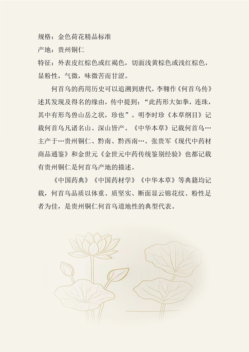 规格:金色荷花精品标准 产地:贵州铜仁 特征:外表皮红棕色或红褐色,切面浅黄棕色或浅红棕色,显粉性,气微,味微苦而甘涩。 何首乌的药用历史可以追溯到唐代,李翱作《何首乌传》述其发现及得名的缘由,传中提到:“此药形大如拳,连珠,其中有形鸟兽山岳之状,珍也”。明李时珍《本草纲目》记载何首乌凡诸名山、深山皆产。《中华本草》记载何首乌…主产于…贵州铜仁、黔南、黔西南…。张贵军《现代中药材商品通鉴》和金世元《金世元中药传统鉴别经验》也都记载有贵州铜仁是何首乌产地的描述。 《中国药典》《中国药材学》《中华本草》等典籍均记载,何首乌品质以体重、质坚实、断面显云锦花纹、粉性足者为佳,是贵州铜仁何首乌道地性的典型代表。