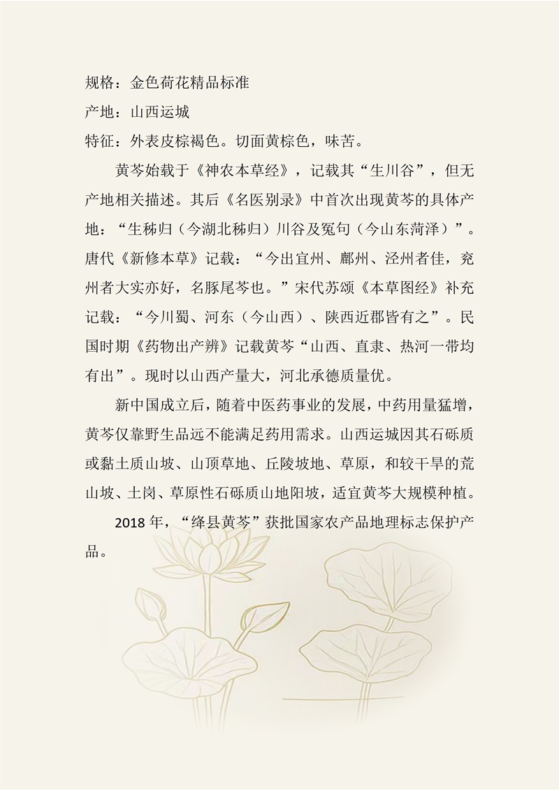 规格:金色荷花精品标准 产地:山西运城 特征:外表皮棕褐色。切面黄棕色,味苦。 黄芩始载于《神农本草经》,记载其“生川谷”,但无产地相关描述。其后《名医别录》中首次出现黄芩的具体产地:“生秭归(今湖北秭归)川谷及冤句(今山东菏泽)”。唐代《新修本草》记载:“今出宜州、鄜州、泾州者佳,兖州者大实亦好,名豚尾芩也。”宋代苏颂《本草图经》补充记载:“今川蜀、河东(今山西)、陕西近郡皆有之”。民国时期《药物出产辨》记载黄芩“山西、直隶、热河一带均有出”。现时以山西产量大,河北承德质量优。 新中国成立后,随着中医药事业的发展,中药用量猛增,黄芩仅靠野生品远不能满足药用需求。山西运城因其石砾质或黏土质山坡、山顶草地、丘陵坡地、草原,和较干旱的荒山坡、土岗、草原性石砾质山地阳坡,适宜黄芩大规模种植。 2018年,“绛县黄芩”获批国家农产品地理标志保护产品。