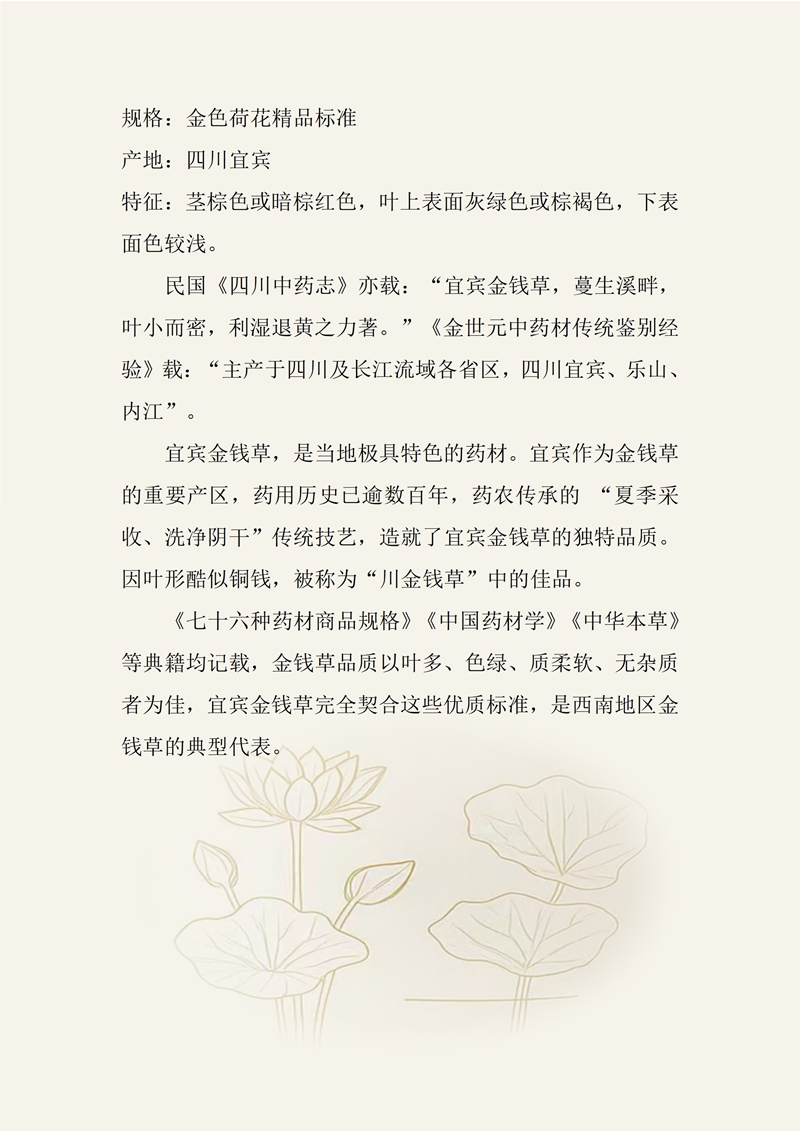 规格:金色荷花精品标准 产地:四川宜宾 特征:茎棕色或暗棕红色,叶上表面灰绿色或棕褐色,下表面色较浅。 民国《四川中药志》亦载:“宜宾金钱草,蔓生溪畔,叶小而密,利湿退黄之力著。”《金世元中药材传统鉴别经验》载:“主产于四川及长江流域各省区,四川宜宾、乐山、内江”。 宜宾金钱草,是当地极具特色的药材。宜宾作为金钱草的重要产区,药用历史已逾数百年,药农传承的“夏季采收、洗净阴干”传统技艺,造就了宜宾金钱草的独特品质。因叶形酷似铜钱,被称为“川金钱草”中的佳品。 《七十六种药材商品规格》《中国药材学》《中华本草》等典籍均记载,金钱草品质以叶多、色绿、质柔软、无杂质者为佳,宜宾金钱草完全契合这些优质标准,是西南地区金钱草的典型代表。