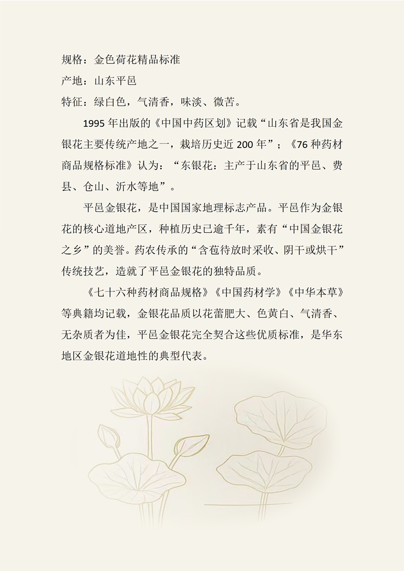 规格:金色荷花精品标准 产地:山东平邑 特征:绿白色,气清香,味淡、微苦。 1995年出版的《中国中药区划》记载“山东省是我国金银花主要传统产地之一,栽培历史近200年”;《76种药材商品规格标准》认为:“东银花:主产于山东省的平邑、费县、仓山、沂水等地”。 平邑金银花,是中国国家地理标志产品。平邑作为金银花的核心道地产区,种植历史已逾千年,素有“中国金银花之乡”的美誉。药农传承的“含苞待放时采收、阴干或烘干”传统技艺,造就了平邑金银花的独特品质。 《七十六种药材商品规格》《中国药材学》《中华本草》等典籍均记载,金银花品质以花蕾肥大、色黄白、气清香、无杂质者为佳,平邑金银花完全契合这些优质标准,是华东地区金银花道地性的典型代表。