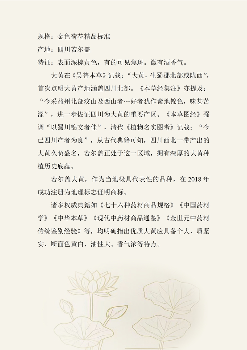 规格:金色荷花精品标准 产地:四川若尔盖 特征:表面深棕黄色,有的可见焦斑。微有酒香气。 大黄在《吴普本草》记载:“大黄,生蜀郡北部或陇西”,首次点明大黄产地涵盖四川北部。《本草经集注》亦提及:“今采益州北部汶山及西山者…好者犹作紫地锦色,味甚苦涩”,进一步佐证四川为大黄的重要产区。《本草图经》强调“以蜀川锦文者佳”,清代《植物名实图考》记载:“今已四川产者为良”,从古代典籍可知,四川西北一带产出的大黄久负盛名,若尔盖正处于这一区域,拥有深厚的大黄种植历史底蕴。 若尔盖大黄,作为当地极具代表性的品种,在2018年成功注册为地理标志证明商标。 诸多权威典籍如《七十六种药材商品规格》《中国药材学》《中华本草》《现代中药材商品通鉴》《金世元中药材传统鉴别经验》等,均明确指出优质大黄应具备个大、质坚实、断面色黄白、油性大、香气浓等特点。