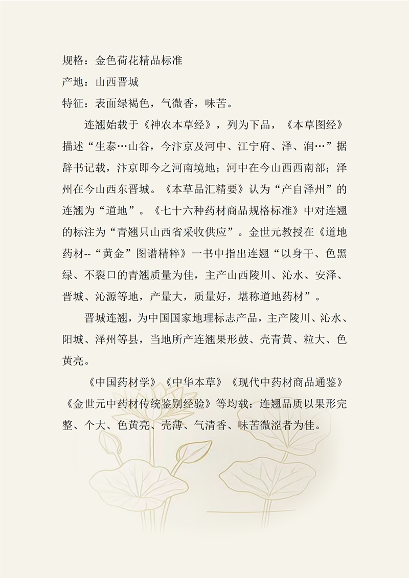 规格:金色荷花精品标准 产地:山西晋城 特征:表面绿褐色,气微香,味苦。 连翘始载于《神农本草经》,列为下品,《本草图经》描述“生泰…山谷,今汴京及河中、江宁府、泽、润…”据辞书记载,汴京即今之河南境地;河中在今山西西南部;泽州在今山西东晋城。《本草品汇精要》认为“产自泽州”的连翘为“道地”。《七十六种药材商品规格标准》中对连翘的标注为“青翘只山西省采收供应”。金世元教授在《道地药材--“黄金”图谱精粹》一书中指出连翘“以身干、色黑绿、不裂口的青翘质量为佳,主产山西陵川、沁水、安泽、晋城、沁源等地,产量大,质量好,堪称道地药材”。 晋城连翘,为中国国家地理标志产品,主产陵川、沁水、阳城、泽州等县,当地所产连翘果形鼓、壳青黄、粒大、色黄亮。 《中国药材学》《中华本草》《现代中药材商品通鉴》《金世元中药材传统鉴别经验》等均载:连翘品质以果形完整、个大、色黄亮、壳薄、气清香、味苦微涩者为佳。