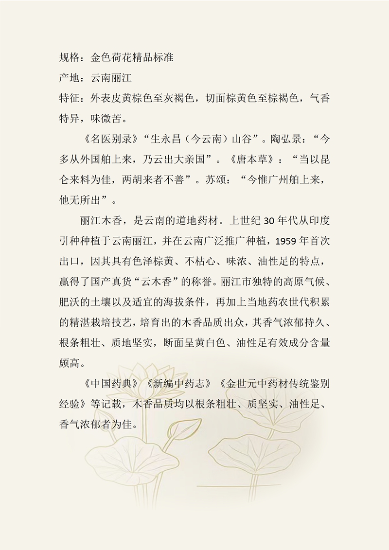 规格:金色荷花精品标准 产地:云南丽江 特征:外表皮黄棕色至灰褐色,切面棕黄色至棕褐色,气香特异,味微苦。 《名医别录》“生永昌(今云南)山谷”。陶弘景:“今多从外国舶上来,乃云出大亲国”。《唐本草》:“当以昆仑来料为佳,两胡来者不善”。苏颂:“今惟广州舶上来,他无所出”。 丽江木香,是云南的道地药材。上世纪30年代从印度引种种植于云南丽江,并在云南广泛推广种植,1959年首次出口,因其具有色泽棕黄、不枯心、味浓、油性足的特点,赢得了国产真货“云木香”的称誉。丽江市独特的高原气候、肥沃的土壤以及适宜的海拔条件,再加上当地药农世代积累的精湛栽培技艺,培育出的木香品质出众,其香气浓郁持久、根条粗壮、质地坚实,断面呈黄白色、油性足有效成分含量颇高。 《中国药典》《新编中药志》《金世元中药材传统鉴别经验》等记载,木香品质均以根条粗壮、质坚实、油性足、香气浓郁者为佳。
